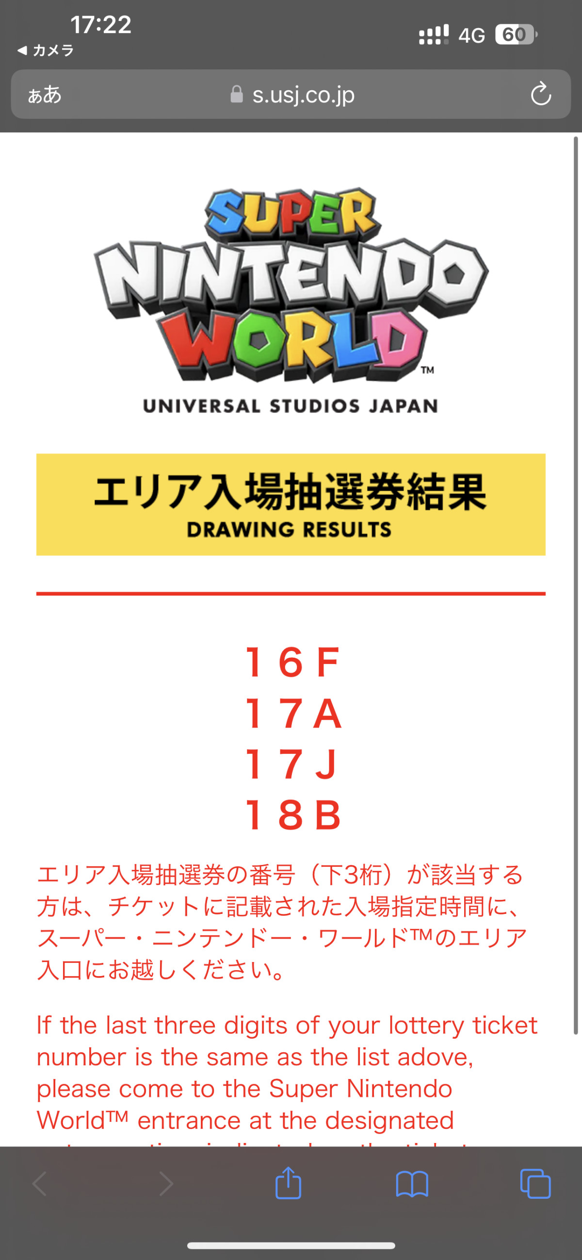 マリオ抽選券の結果発表画面