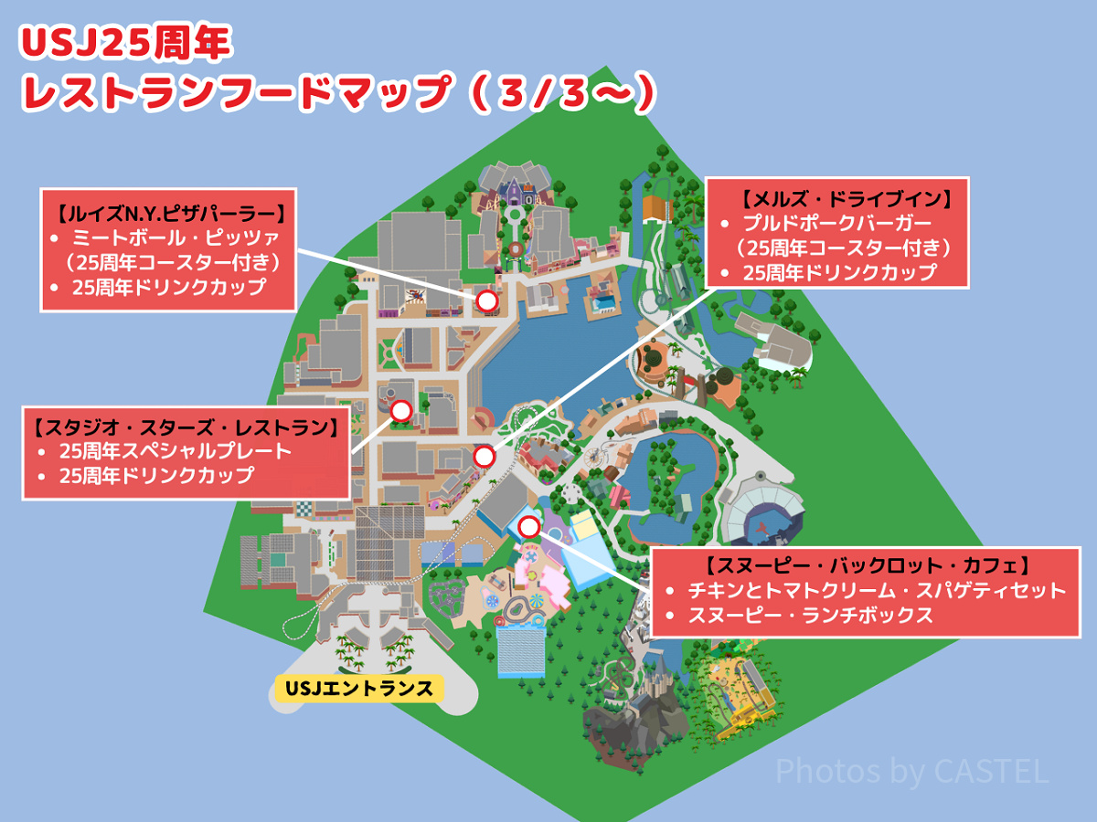 USJ25周年フード販売場所マップ(レストランフード)
