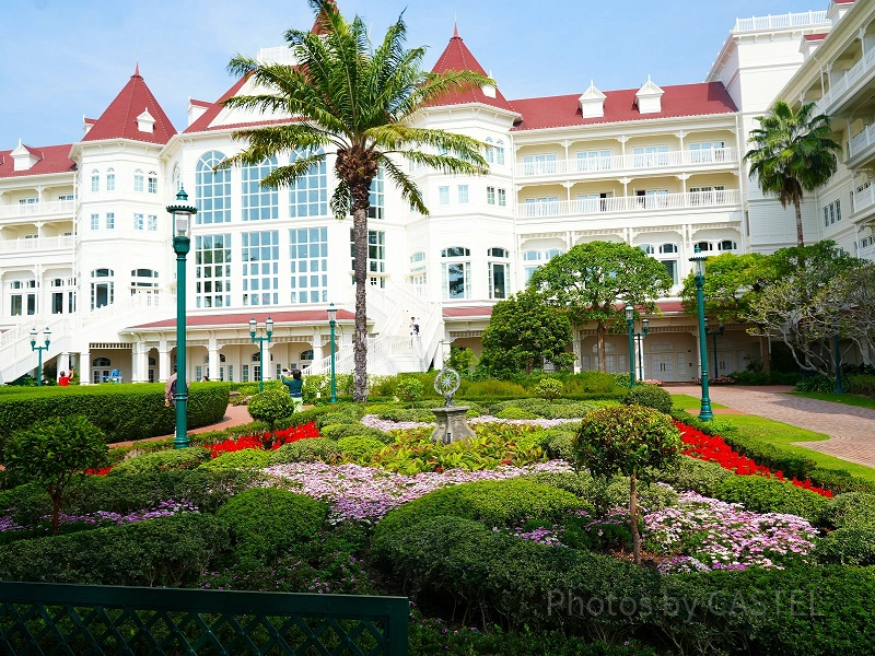 ホテルの正面には広々とした庭園や噴水があり、その周囲にはディズニーキャラクターをモチーフにした装飾が施されています。