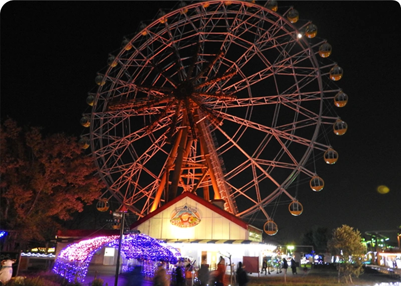 遊園地のアトラクションのライトアップと、無数のイルミネーションが美しいですよ。