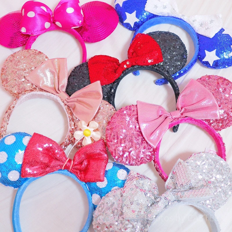 こちらはリボン部分がピンクのスパンコールになっている色違いのミニーカチューシャです。