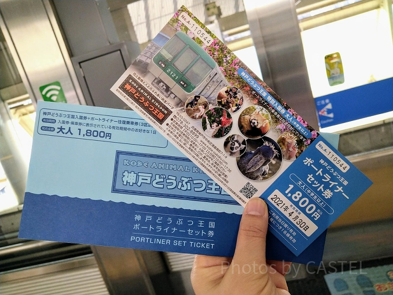 神戸どうぶつ王国の入園券と阪神電車・ポートライナーの往復乗車券がドーンと一緒になったお得なセット券です。